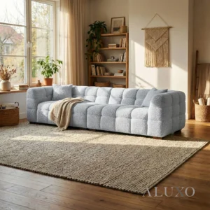 Add a touch of modern luxury to your home with the Aluxo Tribeca Sofa Range. Wrapped in a soft oatmeal-coloured boucle fabric, each piece blends elegance with irresistible comfort. The deep channel stitching and gently curved arms create a bold yet refined silhouette—perfect for both modern and traditional spaces.